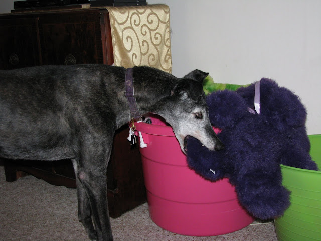 Tonight, however, I saw proof for myself that they really do have quite a little circuit worked out. Bunny and Blueberry ran around and around, turning this way and that then cornering and spinning. All was going at a pretty funny pace and then Lilac got up. Historically, in our house, Lilac's job has been to be the fun police. I was quite surprised this evening to see her get up and actually start playing with the girls. She hasn't done that in years, although she does play with toys on her own. Tonight, she was in there, barking and jumping around with the other two like she was a pup!